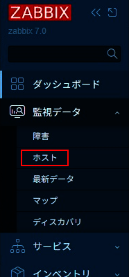 Zabbixにログインするとダッシュボード画面が表示されるので、左のメニューの監視データのタブ内にあるホストをクリックします。