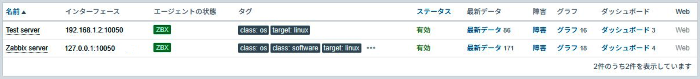 zabbix-agent2.confの設定に問題がなければ、ホスト一覧のエージェントの状態の欄が緑になり、監視対象のサーバーからデータが取得されるようになります。その状態でサーバーの最新データやグラフをクリックすればテンプレートに合わせた情報が表示されます。