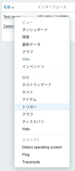 ホスト画面上でアイテムを追加したいホスト名をクリックし、表示されるメニューからトリガーを選択します。