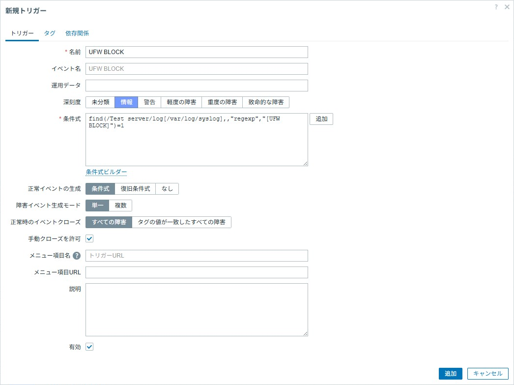 今回の例ではアイテムで取得されたsyslog内に[UFW BLOCK]が記録された際に作動するトリガーをしてみます。
