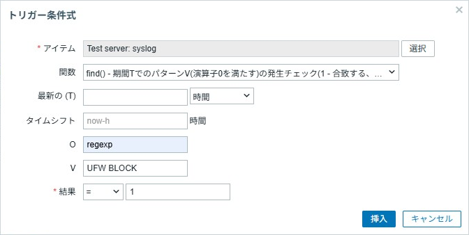 アイテムと関数以外の項目は関数により変化し、find()関数の場合はfind(<アイテム>,<T>,<O>,<V>)=<結果>の形式になり、各項目に入力して挿入をクリックすると型式に当てはめられて条件式に記入されます。今回の例の場合、Tは未入力で問題なく、Vはregexpで正規表現を指定、VにUFW BLOCKでsyslog内の[UFW BLOCK]の項目を検出できます。